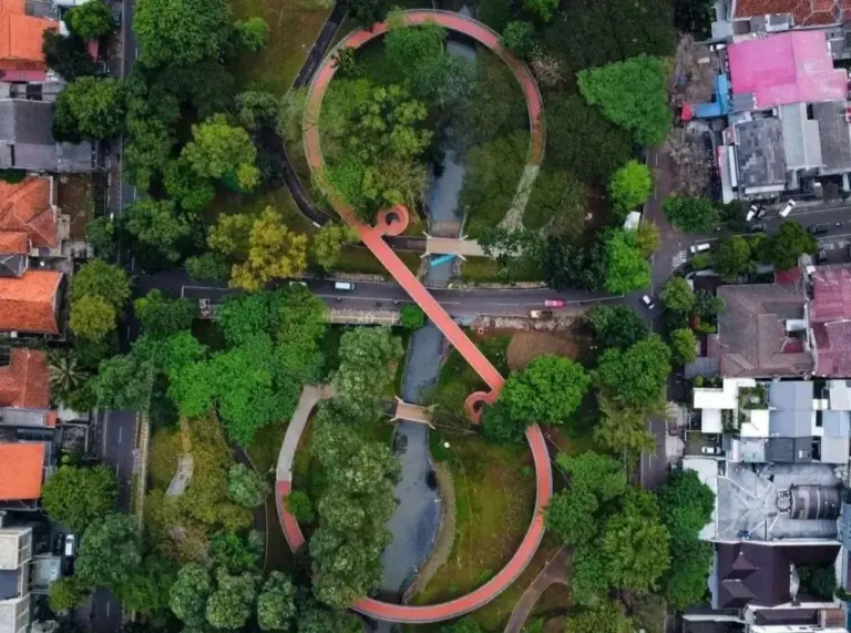 Nama itu, ialah situs ekonik. Ada jembatan elok bercahaya merah-jingga, berpola ‘Infinity’ (angka delapan). Yang estetik dan instagramable. Yang sukses menjodohkan hutan kota dan taman, di sisi utara dan selatan. Yang kawasan tanpa asap rokok. Yang membuat warga membludak ke sana. Pedagang eceran, makanan-minuman, juru parkir pun mendapat cuan.